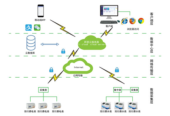 對于分布不同省、地市或同地市不同區(qū)域的連鎖商業(yè)、集團(tuán)、百貨、門店、物業(yè)、院校等業(yè)務(wù)分散,要求集中管理、線上支付,低額提醒、欠費告警。但常規(guī)的本地插卡付費、本地預(yù)付費并不能完全滿足客戶管理需求,預(yù)付費云平臺應(yīng)運而生。AcrelCloud-3200水電預(yù)付費云平臺無縫集成商業(yè)、物業(yè)公司、集團(tuán)企業(yè)、院校等分散布置的安科瑞DDSY/ADF系列電子式預(yù)付費電能表、閥控智能水表等,提供微信、支付寶、銀聯(lián)等可選的在線支付方式,大大方便了用戶充值、圈存,提供預(yù)警和充值、退費、電能消耗等記錄查詢,方便用戶和管理方的數(shù)據(jù)統(tǒng)計和財務(wù)分析,提供先交費后使用的管控機(jī)制,大大降低了管理部門的收費成本。